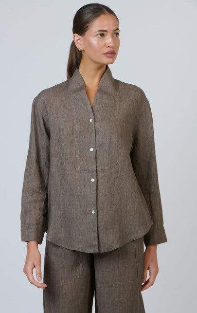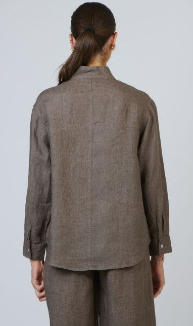 A study in quiet sophistication, the Destiny Top blend's structure and softness in one timeless silhouette. Made from 100% linen, it features a stand collar that gently frames the neckline and a clean button-down front that falls effortlessly over the body. The back drapes naturally, offering ease of movement and an understated finish - the kind of refinement that feels both modern and lasting.