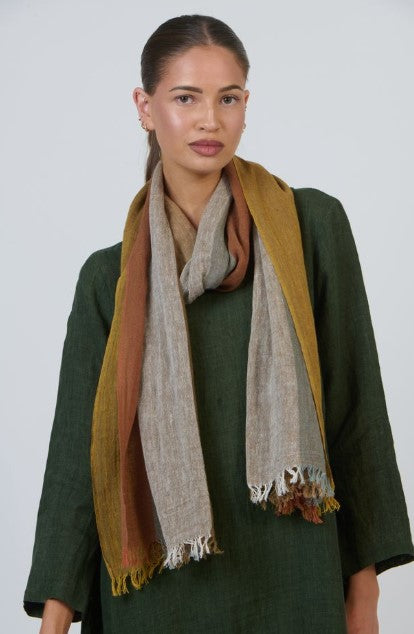 Grounded in warm, natural tones the Mrytle Scarf brings subtle colour and texture to everyday dressing. Crafted from 100% Linen.