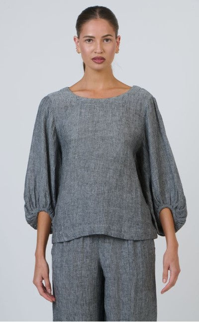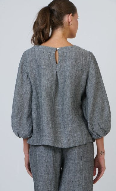 The elbow length bishop sleeves make the Ourimbah top a stand-out piece. The wide trim around the round neck and hem of this top adds an element of charm. A single shell button closure and inverted box pleat on the back rounds out the Ourimbah top.